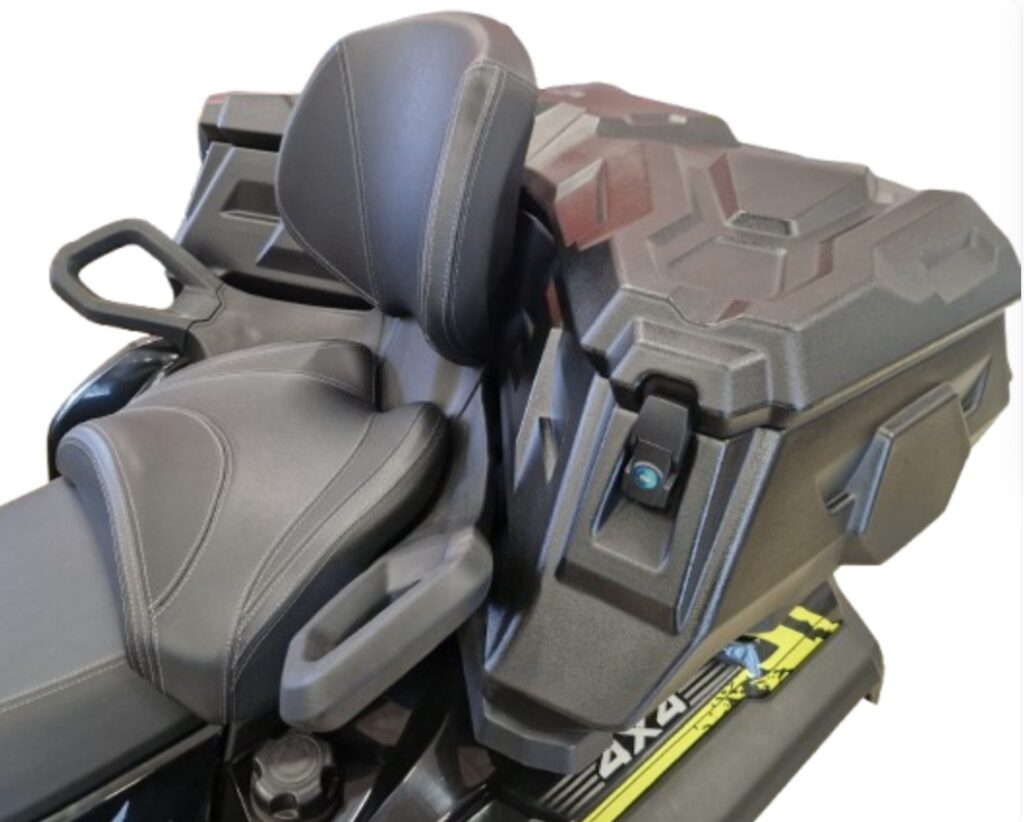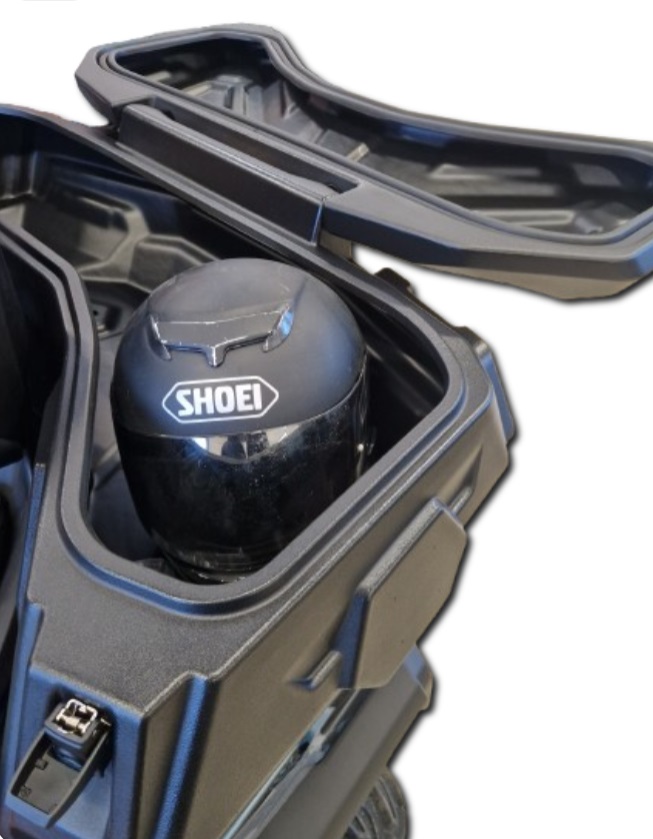 Tässä mönkijän takaboksissa on integroidut lukot eli tavarat pysyvät suojassa pitkäkyntisiltä. Mukana tulee 2 avainta. Tavaralaatikon kannessa on tiiviste joka estää veden menemisen laatikon sisälle. Sinne mahtuu hienosti esimerkiksi kaksi kypärää.