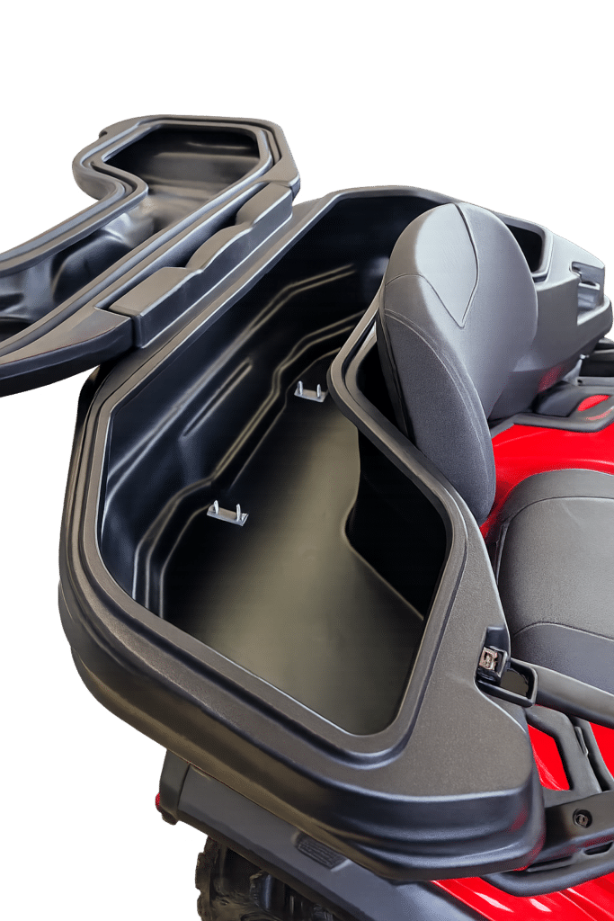 Tässä mönkijän takaboksissa on integroidut lukot eli tavarat pysyvät suojassa pitkäkyntisiltä. Mukana tulee 2 avainta. Tavaralaatikon kannessa on tiiviste joka estää veden menemisen laatikon sisälle. Sinne mahtuu hienosti esimerkiksi kaksi kypärää.