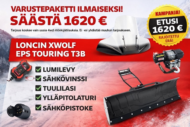 Huippuunsa hiottu laatu ja viimeisin teknologia takaavat, että Loncin on varma valinta parasta hinta-laatu suhdetta etsivälle! LONCIN XWOLF mönkijä on kahdelle rekisteröity T3b luokan mönkijä, huippunopeus on 60km/h. Vakiovarusteina pitkärunkoisessa EPS 700 TOURING mallissa on mm. EPS-ohjaustehostin, kestävät 12″ alumiinivanteet, LED valot, erikoisväri, karkeakuvioiset 26″ renkaat, tehokas 1360kg sähkövinssi. Saksalainen Boschin ruiskujärjestelmä pitää polttoainekulutuksen pienenä, mutta antaa samalla luotettavuutta talvikäynnistyksiin suuren 32Ah kokoisen akun kanssa.