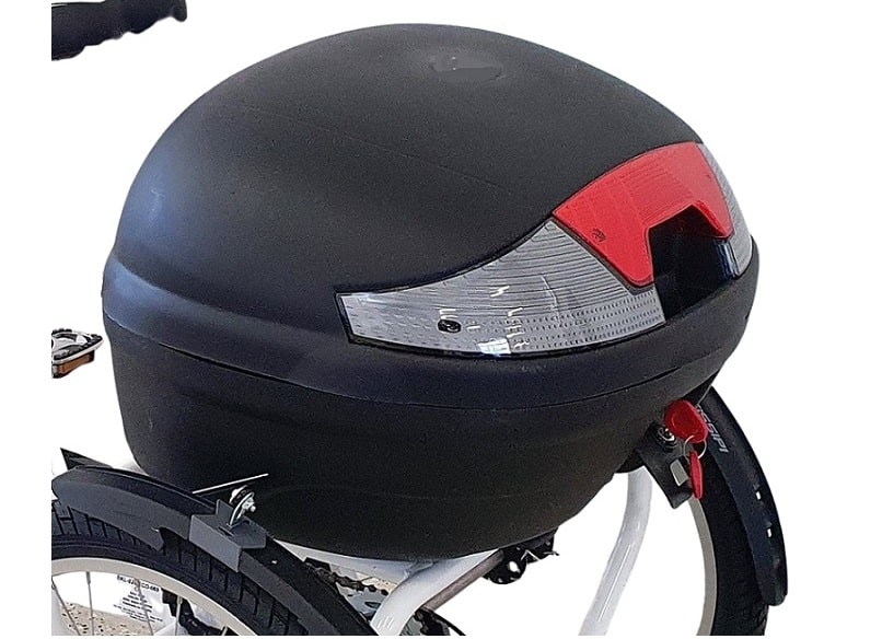 Kolmipyöräisessä sähköpyörässä iso tukeva teräskori takana ostoksille ja tavaroille.